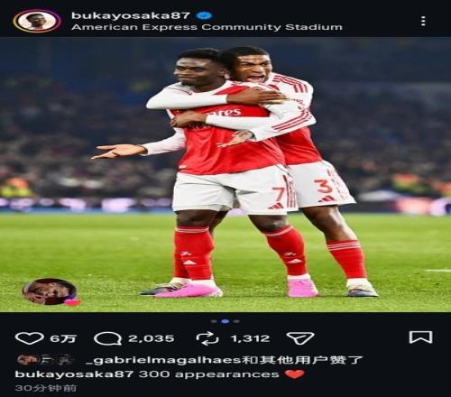本場比賽薩卡迎來生涯為阿森納300次出場里程碑,并且本場他也打進制勝球。賽后他也在個人社媒曬出慶祝進球照片,配文寫道:“300次出場!”