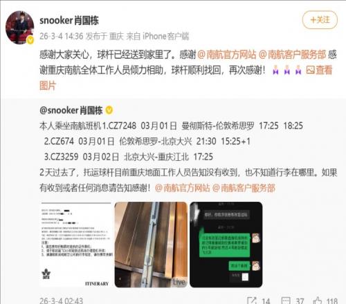 肖國棟在3月4日發文,表示自己在2天前乘坐飛機歸國時托運球桿,結果重慶地面工作人員告知沒有收到,也不知道行李在哪里,并圈了南航官方和客服部。