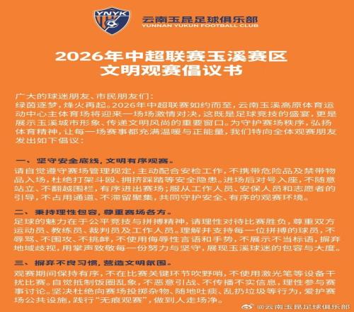 2026年中超聯賽玉溪賽區文明觀賽倡議書