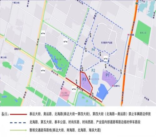 3月7日14時至散場,公安交管部門會根據實時交通流量情況實施臨時交通管制:在北海路與第四大街交口和泰達大街與奧運路交口分別設置硬隔離,禁止機動車、共享單車駛入奧運路。