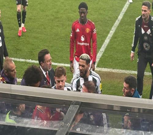B費與喬林頓互嗆,兩人被強行隔開。B費用手指著這位紐卡斯?fàn)柭?lián)的強硬中場,或許是在提醒他能留在場上已是僥幸。