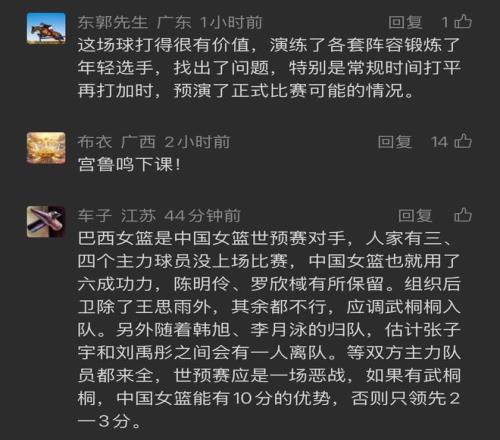 可筆者想說的是,其實我們真的錯怪宮魯鳴了。這場球本來就是練兵,因為第四節一直打不開局面時,主教練也沒有叫暫停,更沒有換上主力球員,目的就是讓年輕人得到成長。如果熱身賽都讓王思雨、楊舒予打滿全場,就算常規時間贏了這場比賽,又有什么鍛煉價值呢?即使這場比賽輸了,也沒有什么,其作用主要是讓我們看到新人的不足,讓她們得到鍛煉,這才是熱身賽的價值所在。