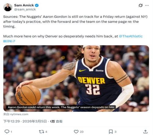 丹佛掘金終于等來兩個好消息。第一個,簽下大衛-羅迪,裁掉貝茨。角色球員,無關痛癢。第二個,阿隆-戈登將在后天對...