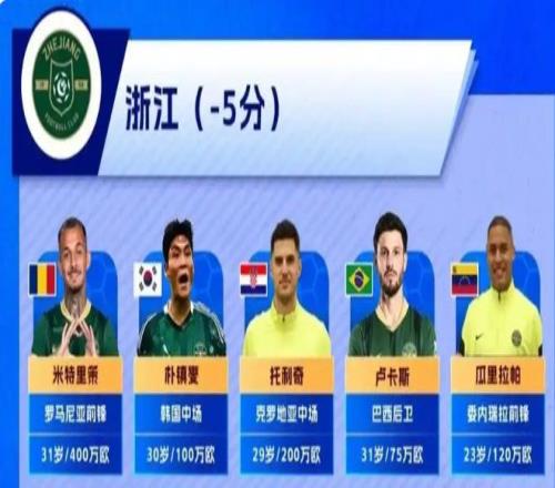 浙江隊(duì)同樣實(shí)力不容小覷。他們引進(jìn)了包括韓國國腳樸鎮(zhèn)燮、克羅地亞中場(chǎng)托利奇、委內(nèi)瑞拉前鋒瓜里拉帕在內(nèi)的多名強(qiáng)援。托利奇曾踢過歐冠和歐聯(lián)杯,攻破過拜仁的大門,他與已經(jīng)成為攻擊線上大腿的米特里策、王鈺棟的配合值得期待。