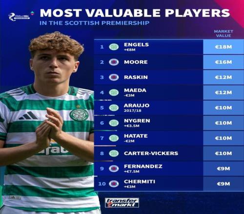 北京時間3月5日,在更新了蘇格蘭超級聯賽球員的身價之后,德轉統計出了此次更新蘇超身價最高的10名球員,凱爾特人的比利時中場恩格斯上漲800萬歐元,目前以1800萬歐元排名第一,熱刺外租格拉斯哥流浪者的小將米凱伊-穆爾1600萬歐元第二,兩位日本球員前田大然和旗手憐央上榜。