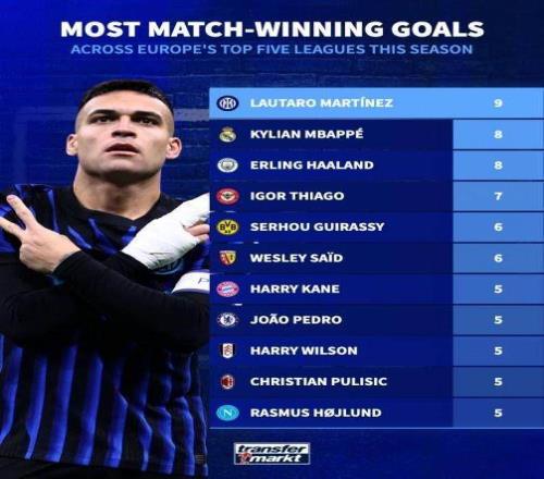 德國轉會市場盤點了本賽季五大聯賽打進制勝球球員情況,勞塔羅以9球居首,姆巴佩和哈蘭德以8球并列次席。以下為具體排名情況: