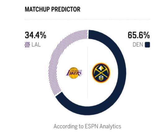 反觀掘金,上一場險勝爵士,目前以38勝24負排在西部第五,本賽季的表現中規中矩。與湖人相似,他們同樣防守一般但進攻亮眼,約基奇場均能拿到三雙,全隊多達七人場均得分上雙,穆雷本賽季狀態十分出色,上一場狂轟45分,但2月份以上,掘金戰績5勝8負,這期間剛好是約基奇復出的節點,他的兩項命中率也跌至46.6%、31.1%,加上鋒線缺少防守能力,掘金繼續戈登、沃特森回歸!不過,結合兩隊現狀,湖人近期狀態尚可,但內線相對薄弱,面對約基奇勢必吃虧;穆雷對陣湖人時總能超常發揮,且個人近期狀態不俗,美媒ESPN預測本場比賽,湖人勝率低至34.4%,掘金勝率高達65.6%。