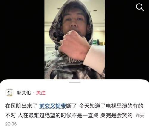 郭艾倫也在個(gè)人社交平臺(tái)回應(yīng)傷情:“在醫(yī)院出來了,前交叉韌帶斷了,今天知道了電視里演的有的不對,人在最難過絕望的時(shí)候不是一直哭,哭完是會(huì)笑的。”