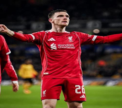 易邊再戰,第51分鐘,利物浦終于撕開防線。薩拉赫右路突破后倒三角回傳,麥卡利斯特順勢橫敲,羅伯遜在禁區外迎球怒射破門,利物浦1-0領先。