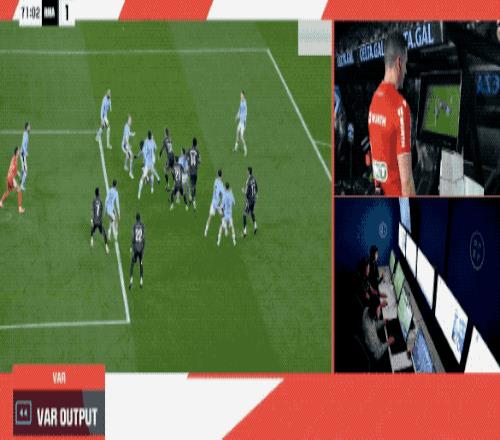 第70分鐘,主裁判叫停比賽,VAR介入,慢鏡頭顯示韋特格拉在本方禁區內明顯手球,但瓊阿梅尼有一個推人的動作,裁判示意沒有點球。