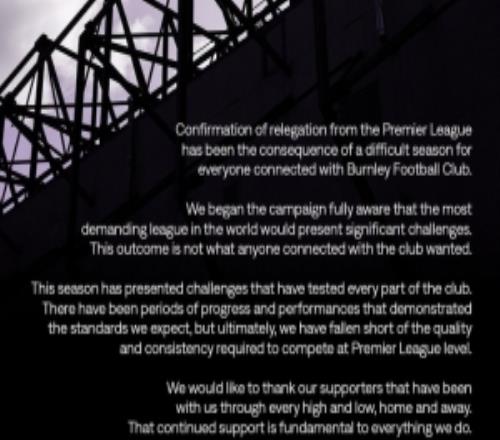 伯恩利降級公告:一個賽季無法定義俱樂部,感謝球迷始終支持我們