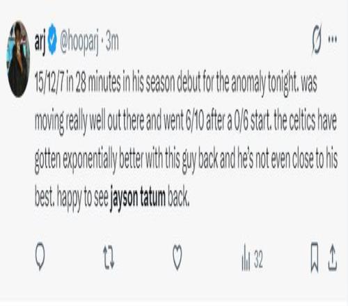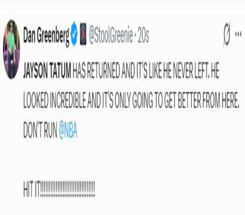 綠凱記者:杰森-塔圖姆終于回歸了!仿佛他從未離開過一樣,他看起來狀態(tài)很好,而且接下來會越來越好。