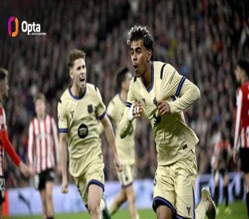 西甲第27輪,巴塞羅那客場對陣畢爾巴鄂競技,下半場亞馬爾破門為巴薩取得領先,至此,亞馬爾本賽季西甲已打入14球,成為本世紀代表巴薩單賽季西甲進球第三多的本土球員。