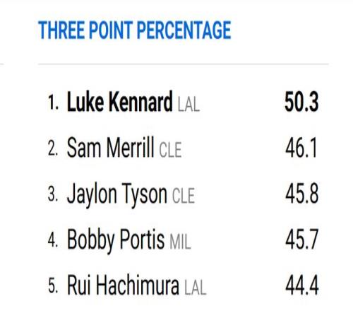 北京時間3月8日,盧克-肯納德是洛杉磯湖人隊一筆極佳的引援,他成為了球隊交易截止日前一直缺少的高效替補得分點。近年來,大多數頂級射手在洛杉磯的聚光燈下都表現掙扎,但肯納德并未出現這種情況。賽季至今,肯納德的三分命中率高達50.3%,在所有符合NBA數據排名的166名球員中高居第一,目前為湖人出戰的13場比賽,三分命中率更是高達52.5%!