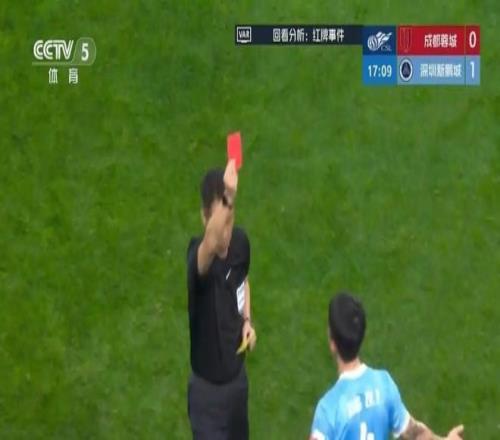 本場比賽的導火索,是開場16分鐘的VAR改判。深圳隊姜至鵬在防守中抬肘,擊中成都外援韋林頓面部,導致后者流血不止,最終縫了15針、牙齒脫位。主裁判原本出示黃牌,經VAR提醒后改判直紅,深圳隊被迫10人作戰,隨后防線徹底崩盤,最終吞下1-5的慘敗。