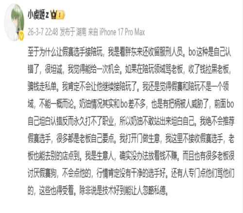我絕不會推薦假賽選手,很多都是老板自己要點。我打開門做生意,我這里不接收假賽選手,老板也能去別的店點到。我是生意人,確實沒辦法放著錢不賺。而且也有很多老板很討厭假賽狗,不會點他的,行情肯定沒有干凈的選手好。還有人專門點他們罵他們的,這些也得受著。除非說是技術好到能讓人忽略私德。