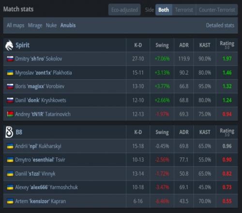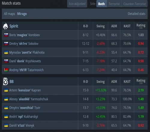 易邊再戰(zhàn),來(lái)到進(jìn)攻方donk手槍局雙殺掃蕩B點(diǎn)拿到第4分。次回合B8強(qiáng)起,donk中路爆轟雙殺,esenthial與kensizor雙人看B四殺幫助B8拿到第10分。綠龍連E兩把讓出賽點(diǎn)。第17回合長(zhǎng)槍局,綠龍拱門夾A未果,B8以13-4拿下圖一。