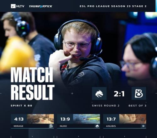 體育播報(bào)3月8日宣 CS2大賽EPL S23第二階段繼續(xù)進(jìn)行,在瑞士輪1-0組中,Spirit完成讓一追二戰(zhàn)勝B8,迎來(lái)兩連勝晉級(jí)在望!