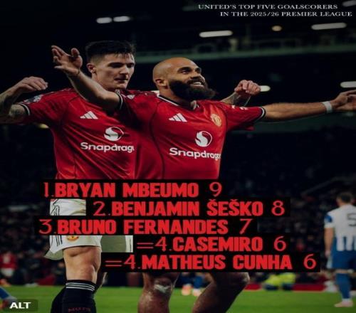 3 - 曼聯(lián)官方曬隊(duì)內(nèi)英超射手榜前五:姆伯莫9球暫居第一