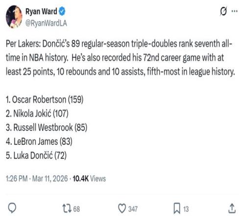 這是東契奇加盟湖人僅一個(gè)賽季第6次拿下30+三雙,成功超越名宿科比,獨(dú)占湖人隊(duì)史第五。