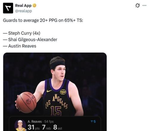 本賽季里夫斯可謂是高產(chǎn)又高效,場(chǎng)均可以轟下23.7分,真實(shí)命中率高達(dá)65.1%,是NBA歷史上第三位做到這一點(diǎn)的后衛(wèi)球員,另外兩人是庫(kù)里(4次)和亞歷山大,可見(jiàn)這一項(xiàng)紀(jì)錄的含金量之高。