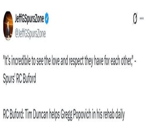 馬刺CEO布福德近日做客法國節目《FirstTeam》,談到了波波維奇的恢復情況、鄧肯每天的陪伴。“波波維奇康復路上最動人的一點是,蒂姆每天都在球館陪著他,”布福德說,“當吉諾比利、帕克或迪奧從外地回來時,也會一直陪在他身邊。能看到他們彼此之間的愛與尊重,真的太不可思議了。”