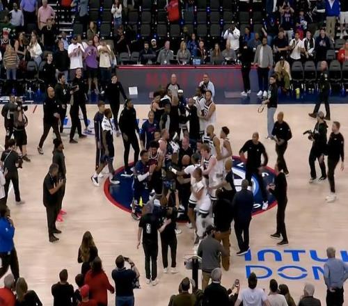 而在比賽結(jié)束之后,雙方場(chǎng)上還發(fā)生了不愉快,雙方致意的時(shí)候,馬瑟林與麥克丹尼爾斯發(fā)生爭執(zhí),隨后球員立馬聚集在一起,現(xiàn)場(chǎng)也是亂作一團(tuán)。而在這個(gè)時(shí)候,快船其他球員也是紛紛護(hù)住馬瑟林,鄧恩更是第一時(shí)間保護(hù)在他身前。在本賽季此前的比賽,鄧恩也是多次為隊(duì)友出頭,他也是非常樂意這么去做,好在其他球員十分冷靜,沒有出現(xiàn)進(jìn)一步的沖突。