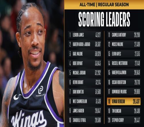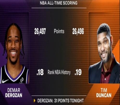 截至發稿,德羅贊本場已得到31分,生涯總分來到26497分,超越鄧肯(26496分),升至NBA歷史第18位!