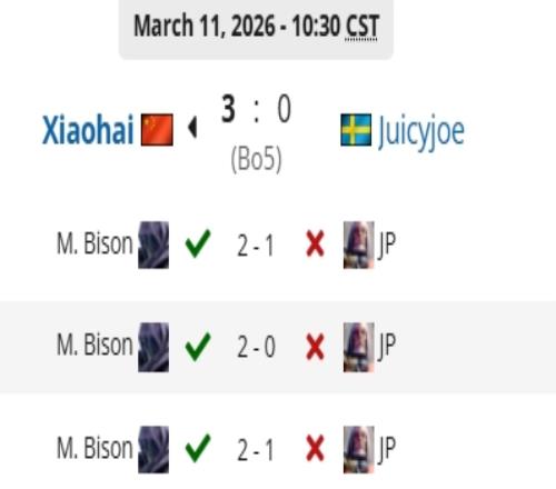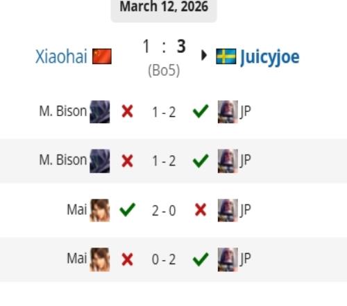 體育播報3月12日宣第12屆卡普空杯第一階段A組敗者組決賽上小孩交手Juicyjoe,大比分1-3遭到淘汰,無緣十六強!
