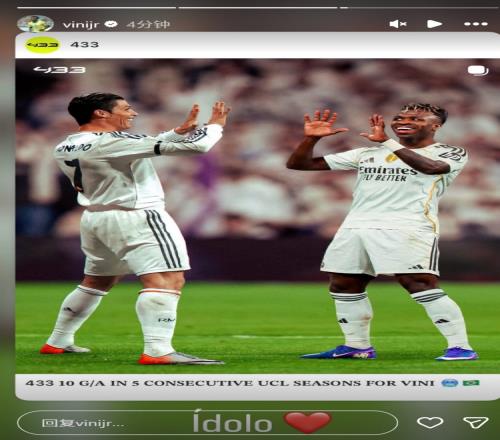維尼修斯社媒轉發433制作的他與C羅的同框圖片,配文:“偶像。”