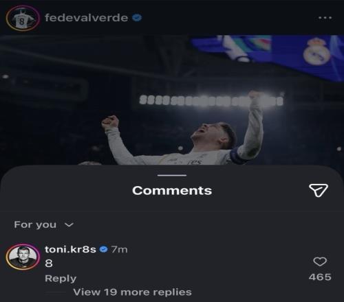 今天凌晨,皇馬在歐冠3-0擊敗曼城,巴爾韋德上半場帽子戲法,賽后克羅斯在巴爾韋德的Instagram評論區現身,并評論了一個“8”。
