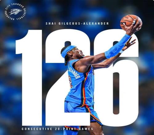 近日,亞歷山大得到35分15次助攻9個籃板的準三雙,率殘陣雷霆擊潰掘金。最后時刻,亞歷山大連中2記三分,帶走勝利。本場得到35分,也讓亞歷山大連續得分20+的場次達到126場,追平張伯倫在1962年締造的紀錄。賽后,亞歷山大表示,和那樣的人相提并論,這很特別。