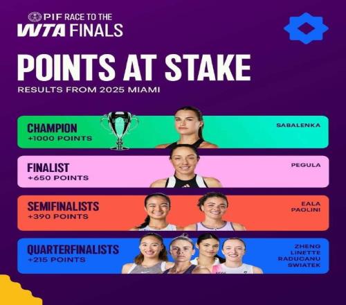 WTA邁阿密站保分情況:薩巴倫卡1000分,鄭欽文、斯瓦泰克215分