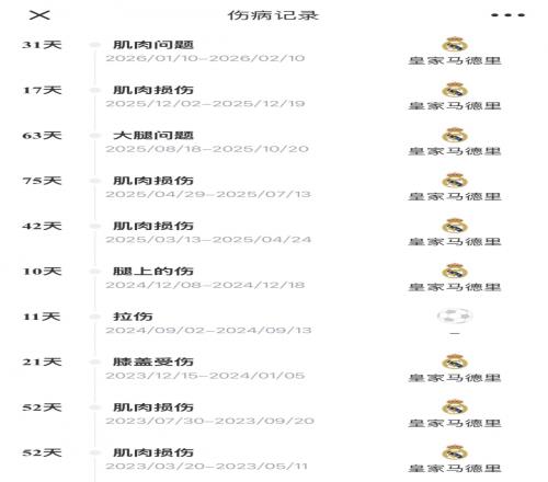 門迪本賽季已遭遇了4次傷病,大多都為肌肉問題,他本賽季僅為皇馬出場5次,共計(jì)247分鐘。他效力皇馬至今7個(gè)賽季遭遇了至少21次傷病。