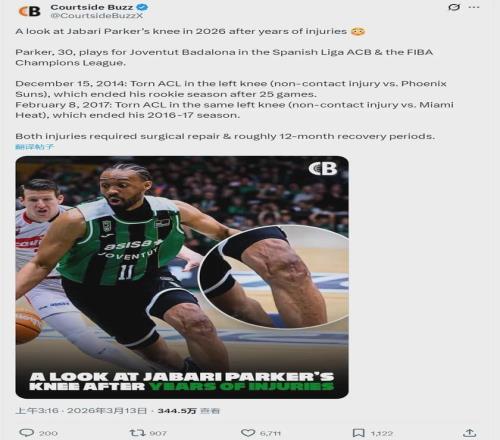 還記得前NBA榜眼秀賈巴里-帕克嗎?近日他因為一張照片登上熱搜。賈巴里-帕克目前在西班牙打球,媒體Courtside Buzz曬出帕克的賽場照:左膝蓋兩條手術疤痕非常明顯。評論區的球迷寫道:“如今帕克還在打籃球,我對此充滿敬意。”