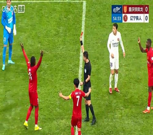 下半場,重慶銅梁龍加強進攻,效果終于在第58分鐘時呈現。外援肯帕努帶球突破到禁區外,客隊外援瓦吉奇鏟球放倒。由于是最后一名防守球員,主裁判馬寧當機立斷掏出紅牌將其罰下,遼寧鐵人開始少打1人。