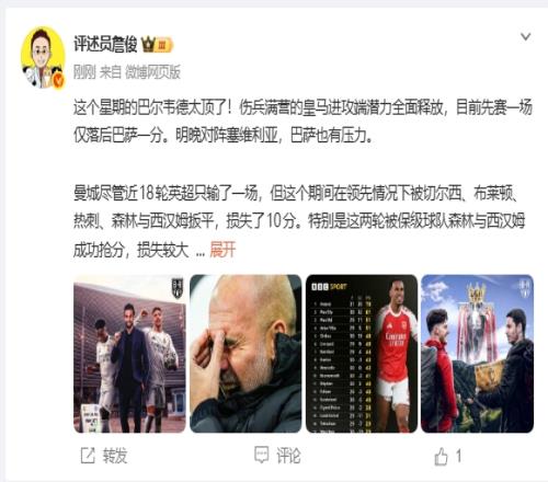 體育播報03月15日宣 本輪英超結(jié)束多場對陣,阿森納2-0埃弗頓,曼城1-1西漢姆。賽后評述員詹俊發(fā)文。