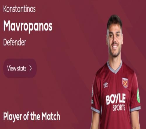體育播報03月15日宣 英超第30輪,西漢姆聯主場1-1戰平曼城,阿森納舊將馬夫羅帕諾斯憑借關鍵進球當選全場最佳球員。