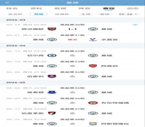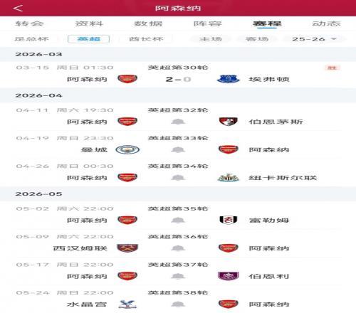 未來(lái)賽程方面,阿森納還有最后7輪聯(lián)賽,曼城還有8輪聯(lián)賽要踢,其中第33輪兩隊(duì)將在阿提哈德球場(chǎng)迎來(lái)爭(zhēng)冠的直接對(duì)話。