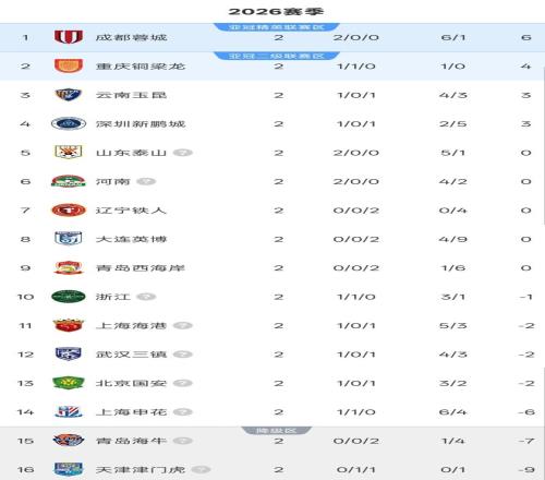 北京時(shí)間3月15日,隨著第三個(gè)比賽日3場比賽順利進(jìn)行,2026賽季中超聯(lián)賽第2輪比賽全部結(jié)束。2輪過后的積分榜,3支球隊(duì)奪得2連勝,成都蓉城6分繼續(xù)領(lǐng)跑,2支球隊(duì)完成“負(fù)分清零”,另有4隊(duì)有望下輪實(shí)現(xiàn)積分轉(zhuǎn)正。