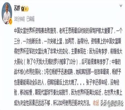賽后,知名媒體人蘇群發(fā)文點評: