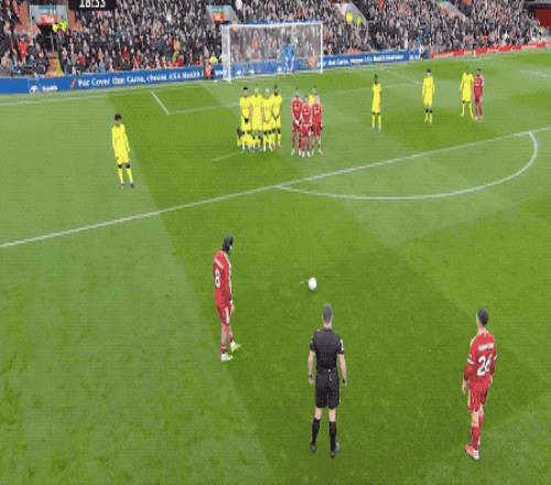 比賽開始后,利物浦率先占據主動。第19分鐘,麥卡利斯特制造任意球機會,索博斯洛伊打出一記精彩的弧線球,皮球越過人墻直奔死角,即便維卡里奧奮力撲救也無法阻止進球。利物浦1-0領先。這粒世界波讓安菲爾德沸騰。