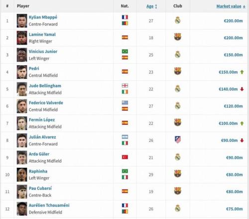 姆巴佩與亞馬爾身價沒有變動,依然是2億歐,并列西甲榜首,維尼修斯身價1.5億歐并列第三。