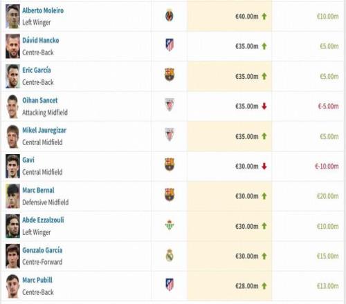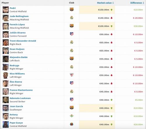 西甲身價更新:費爾明暴漲3000萬歐升至1億,貝林下降2000萬歐