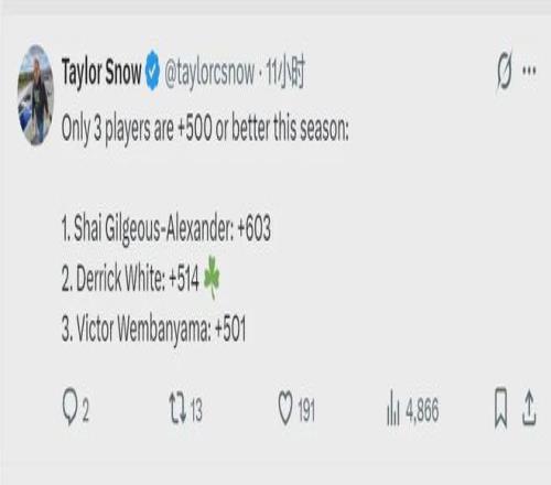 截至今天賽前,NBA聯(lián)盟僅有3名球員賽季總正負(fù)值超過(guò)+500,他們分別是:1、亞歷山大+603;2、德里克-懷特+514;3、文班亞馬+501。不滿(mǎn)500但超過(guò)400的有:霍姆格倫+490、坎寧安+484、尚帕尼+462、約基奇+437。