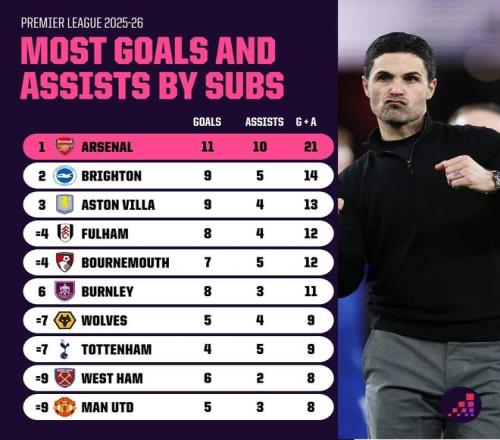 Opta列出了本賽季英超球隊替補球員參與進球榜,阿森納以21球居首,領(lǐng)先第二名的布萊頓7球,曼城以2球墊底。