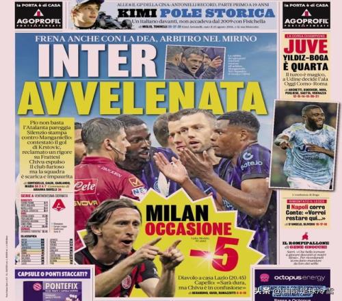 在國米平了亞特蘭大時,這些意媒瘋狂炒作國米領先優勢將縮水,頭版頭條基本全都有“只差5分”的描述。