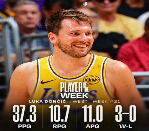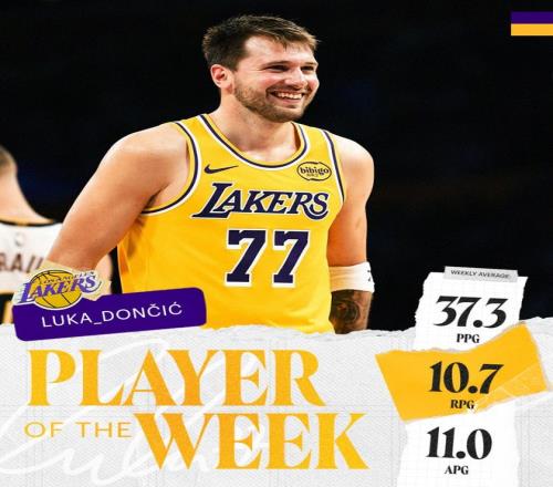 湖人后衛東契奇當選西部周最佳球員。這是他本賽季第3次獲此殊榮,職業生涯第18次當選。