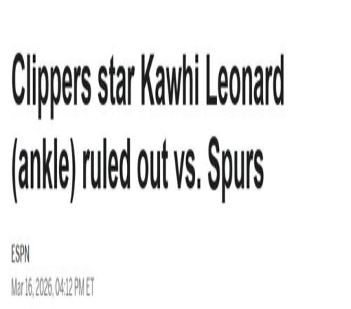 北京時間3月17日,洛杉磯快船球星科懷-萊昂納德因左腳踝扭傷,將缺席今日對陣舊主馬刺的比賽。