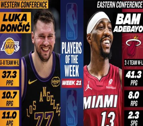 NBA官方公布了第21周的東西部周最佳球員,東部由熱火前鋒阿德巴約當選,西部由湖人后衛東契奇當選。阿德巴約上周場均爆砍41.3分+8籃板+2助攻+2.3搶斷+1.3蓋帽,帶領熱火隊取得2勝1負的戰績。據統計,這是阿德巴約本賽季第2次拿到周最佳,也是阿德巴約生涯第4次獲此殊榮。東契奇上周場均豪取37.3分+10.7籃板+11助攻+2搶斷+1.7蓋帽,帶領湖人隊取得3勝0負的戰績。據統計,這是東契奇本賽季第3次拿到周最佳,也是東契奇生涯第18次拿到該獎項。除此之外,布克、德羅贊、SGA、小卡、里夫斯、文班亞馬、班凱羅、貝恩、布倫森、康寧漢姆、杜倫、英格拉姆、杰倫約翰遜等人獲得了周最佳提名。